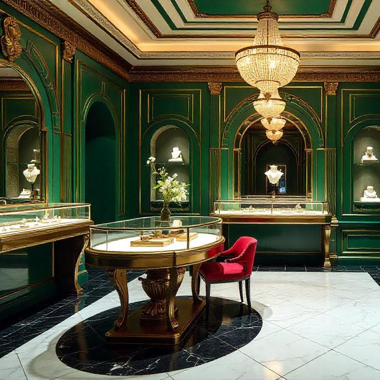 - Materiales lujosos: Mármol, maderas exóticas, metales pulidos y terciopelo.